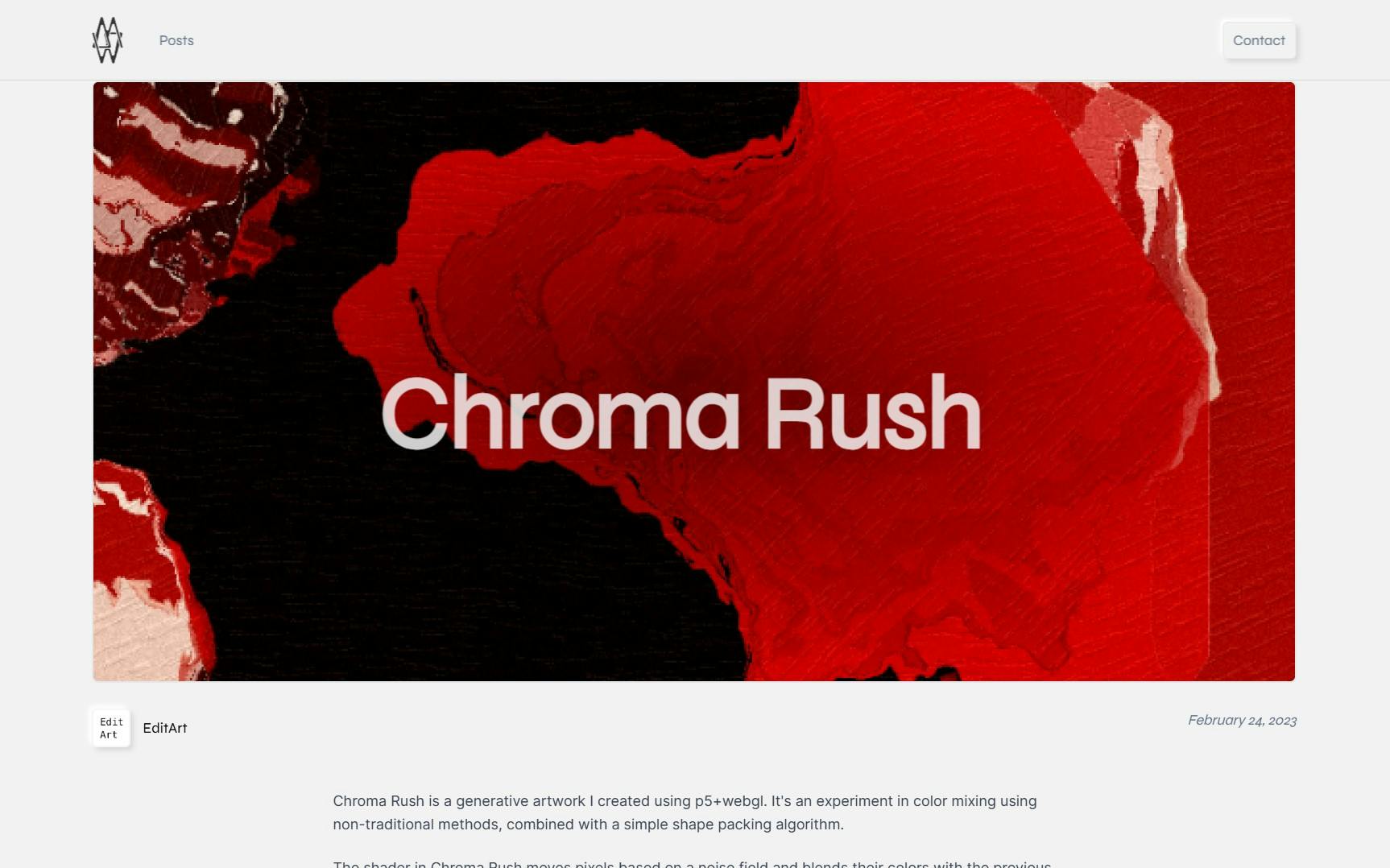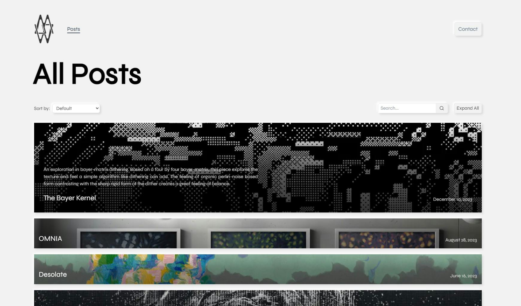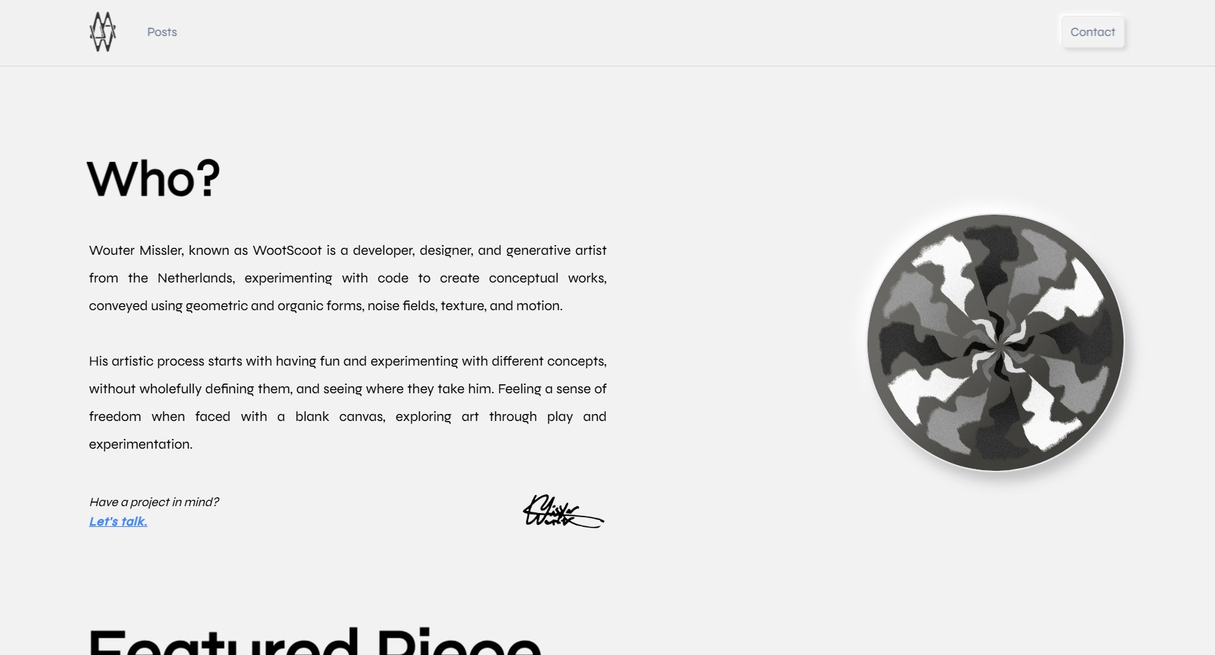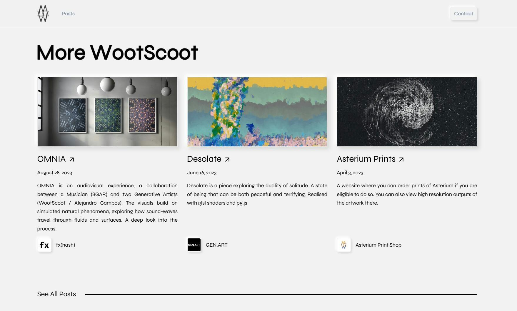WootScoot Art is a portfolio page dedicated to my generative artworks, it showcases them in a newspaper-esque style. It uses a custom Markdown file parser that can convert simple Markdown into pre-rendered blog-style pages. Besides that it also has some simple integrations with the Tezos chain.